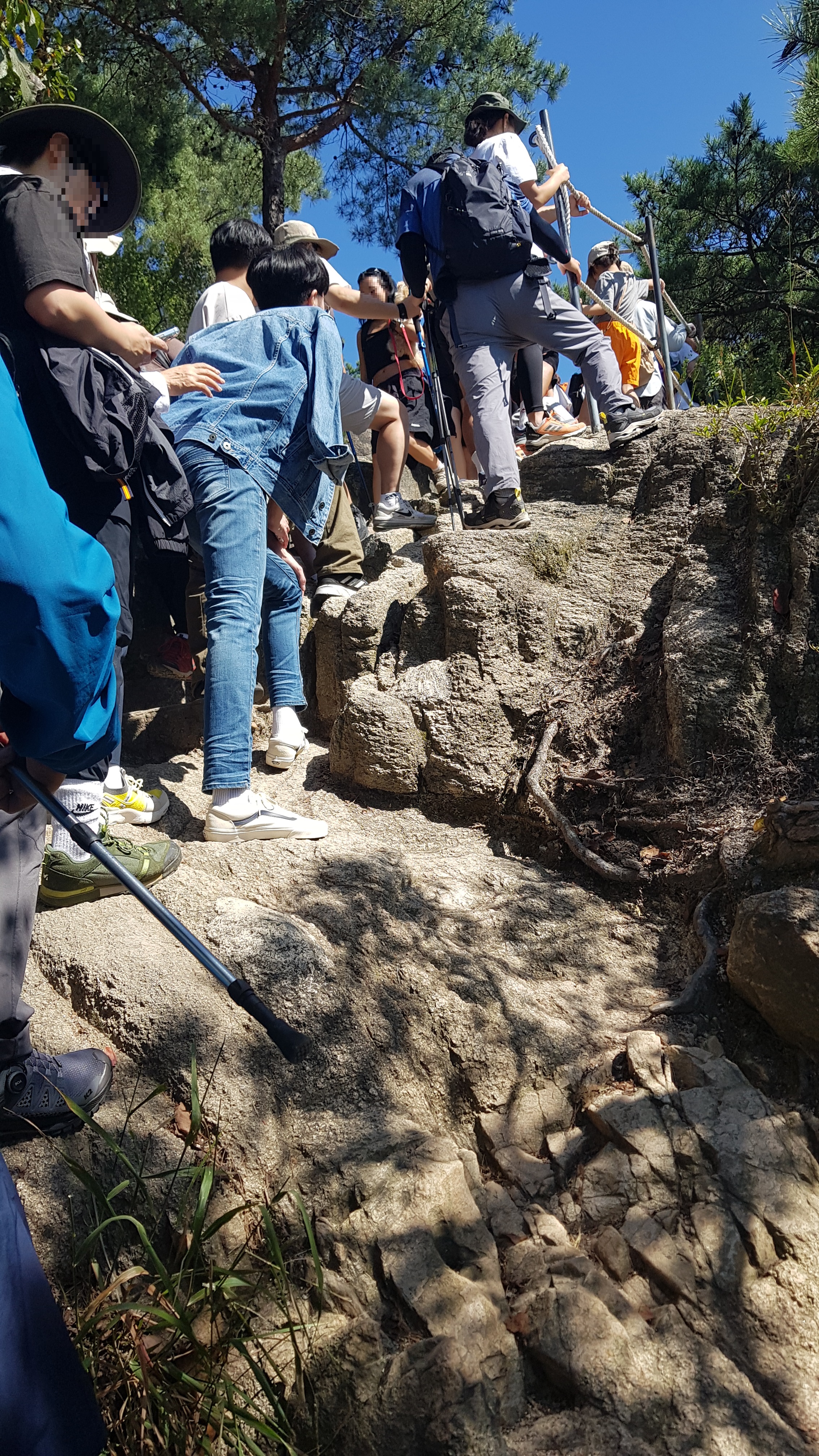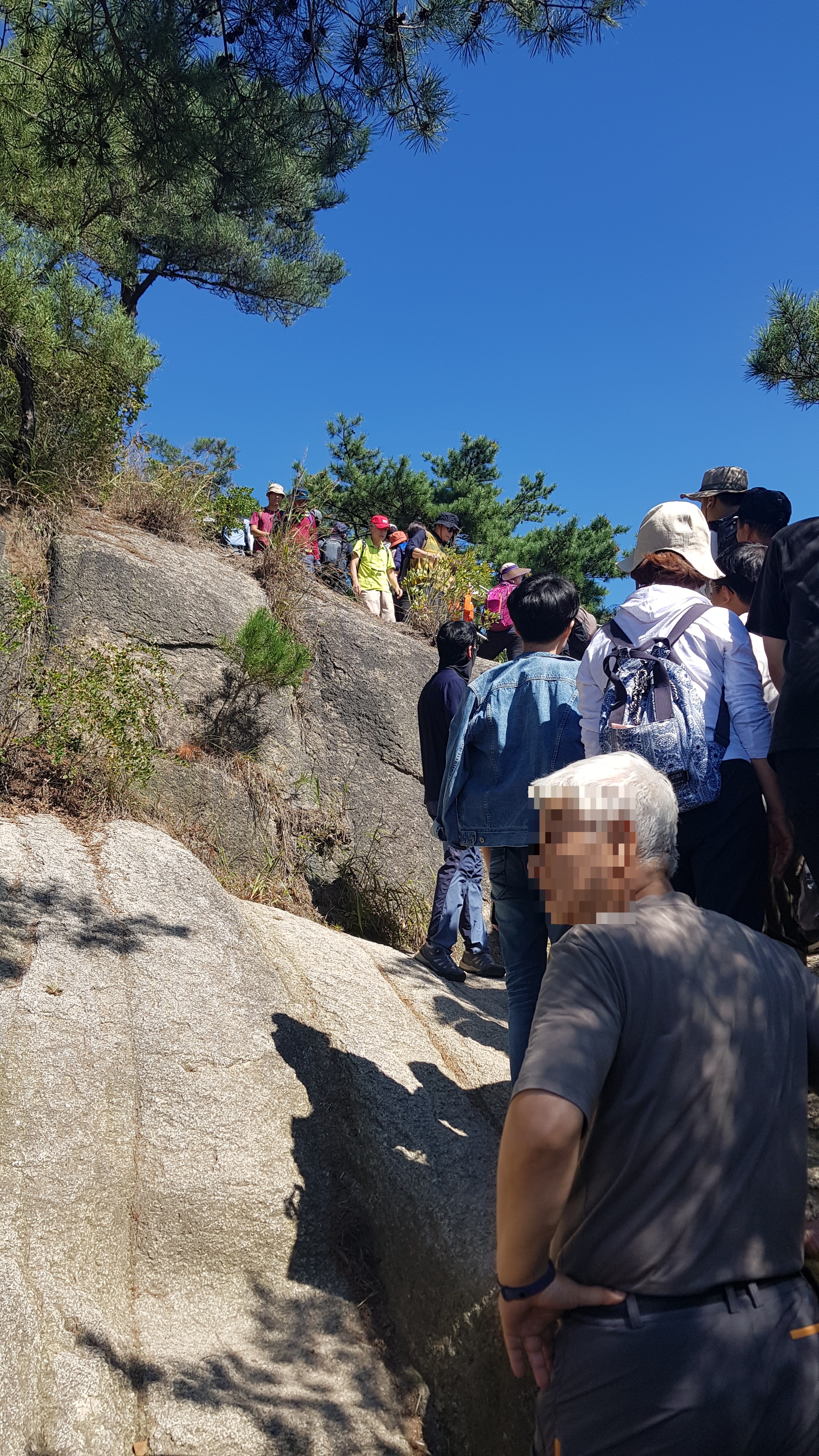 정상을 앞둔 마지막 암벽구간인데, 오르는 사람과 내려가는 사람이 너무 많아서 가만히 서 있다.